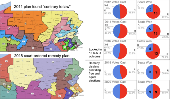 In 2018 and 2020, that remedy map provided a congressional delegation of 9 Republicans and 9 Democrats, much closer to the vote share of both elections.